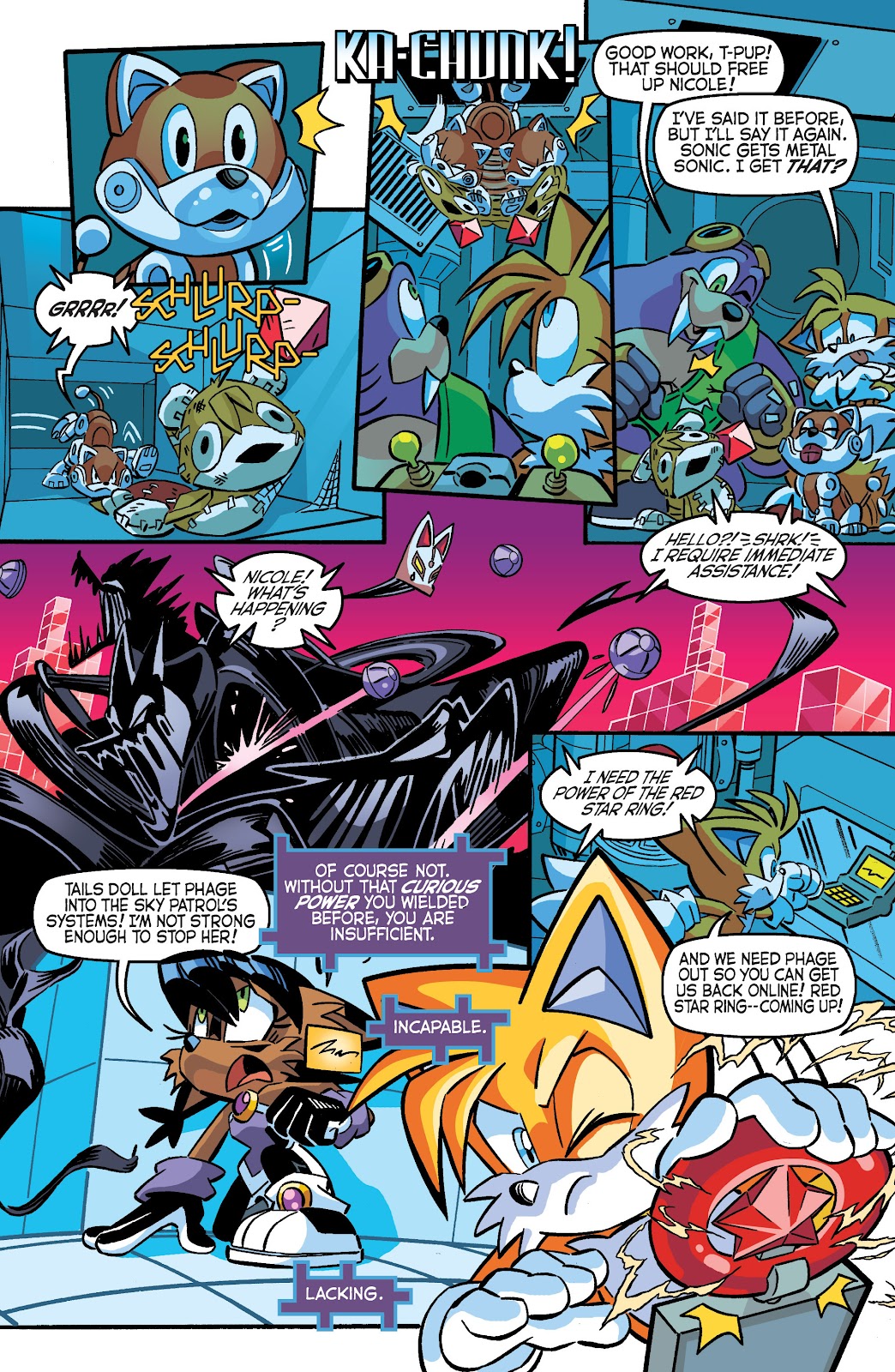 Unmatched ambition, futuristic technology, and seemingly infinite resources fuel Dr. Eggman’s endeavours, none of which factored into Tails Doll’s creation. The only thing distinguishing it from a nugatory plush is the Doll’s paltry powersource, the ruby protruding from its head. It’s an appreciated accoutrement; red gemstones are said to “boost energy,” it synergizes with the curio’s patchwork “shoes,” and adds flair and mystique to the character’s otherwise simplistic design. Nevertheless, the character’s still an antediluvian toy, starkly contrasting the machines it raced alongside. Eggman harbored enough respect for Sonic and Knuckles to construct cold, high-tech beings in their likenesses, and even the mass-produced Eggrobo units are more imposing, advanced combatants than a stuffed animal. Such a half-hearted effort in engineering a parallel for Tails suggests Eggman didn’t think highly of him, an insinuation the fox laments in the Archie realm. It’s ironic, since he’s a technology-savvy genius on par with the mad scientist – Sonic Adventure 2 even posited the kid as Robotnik’s heroic analog just three years after R’s release.