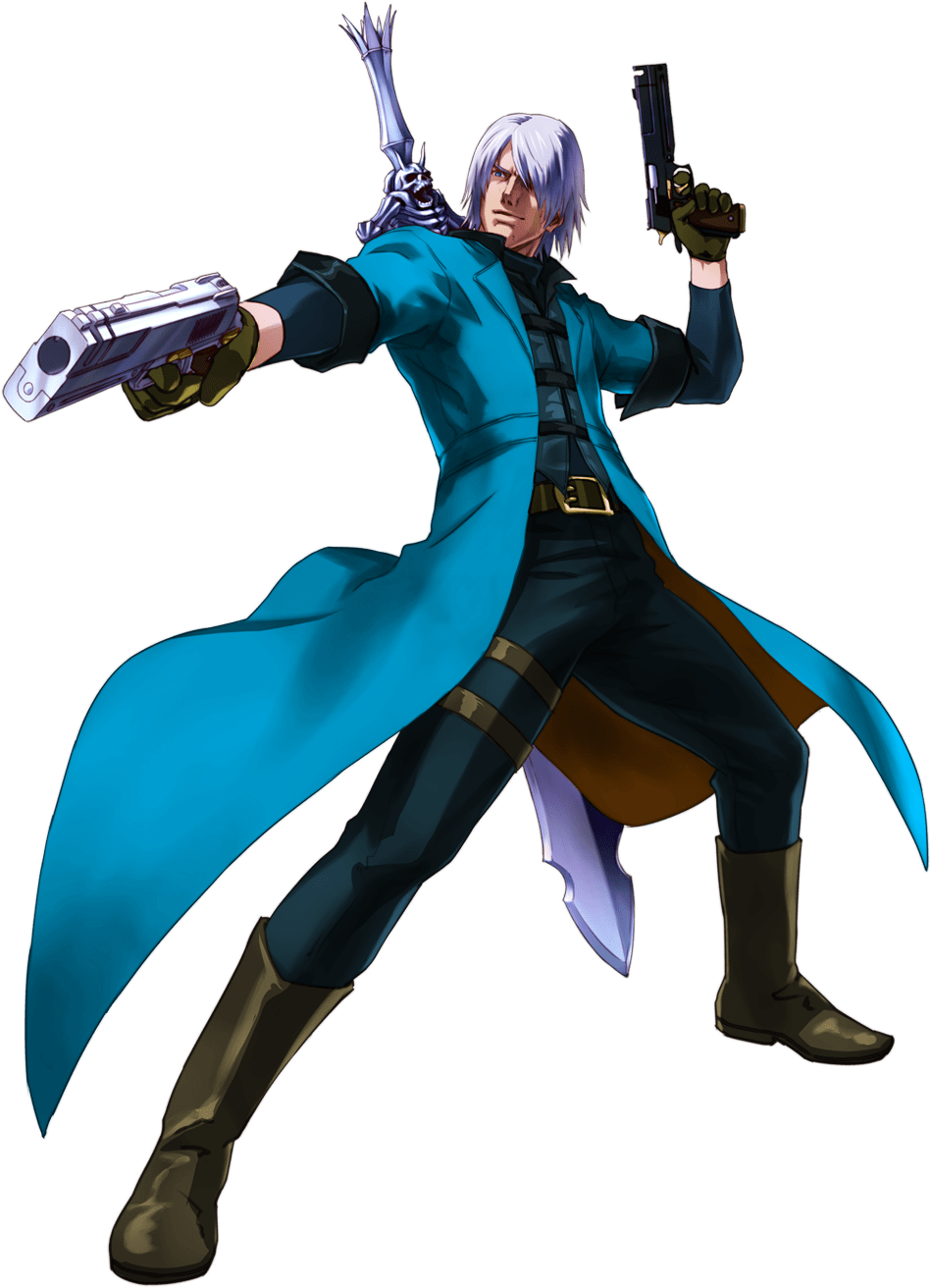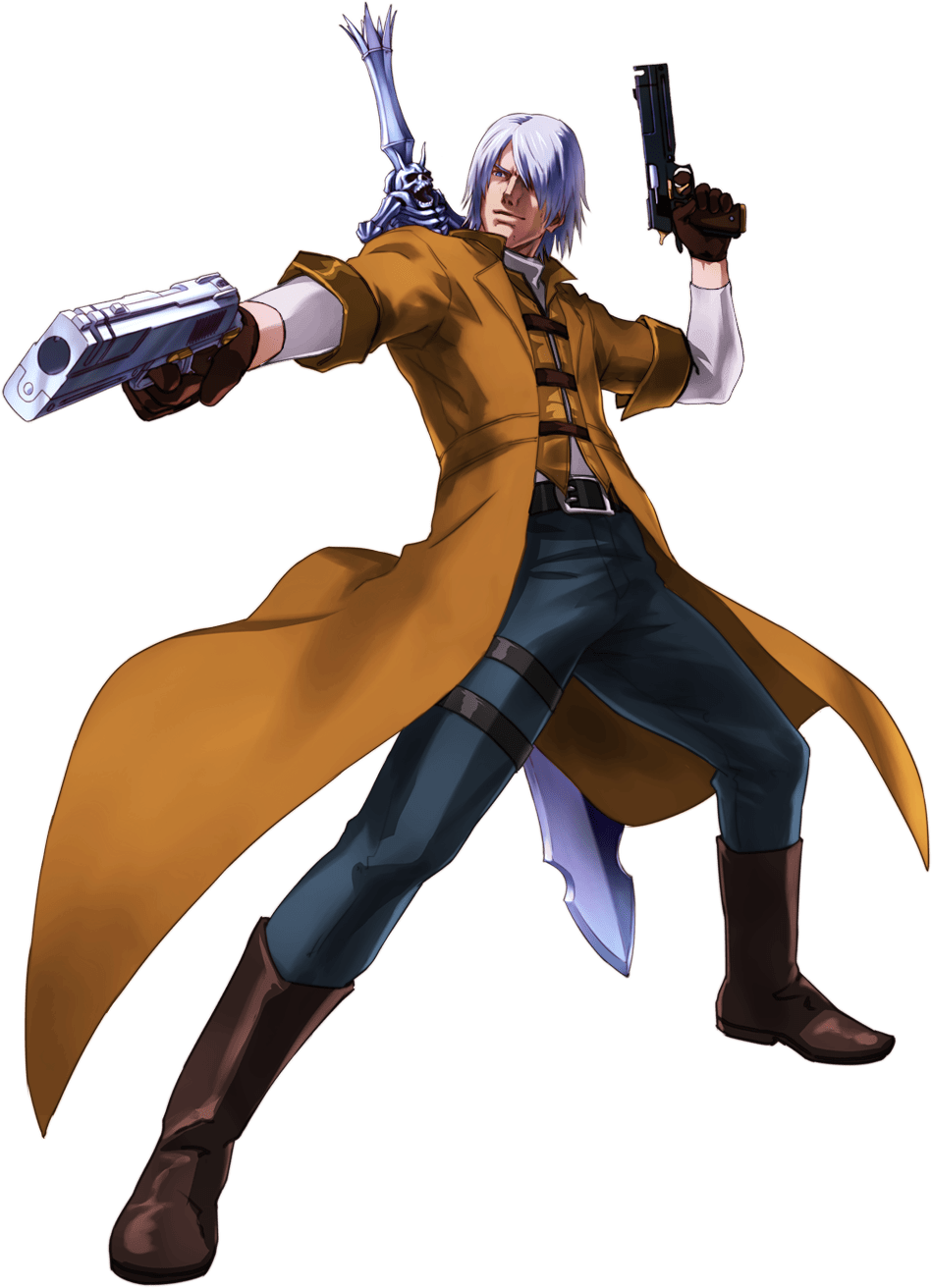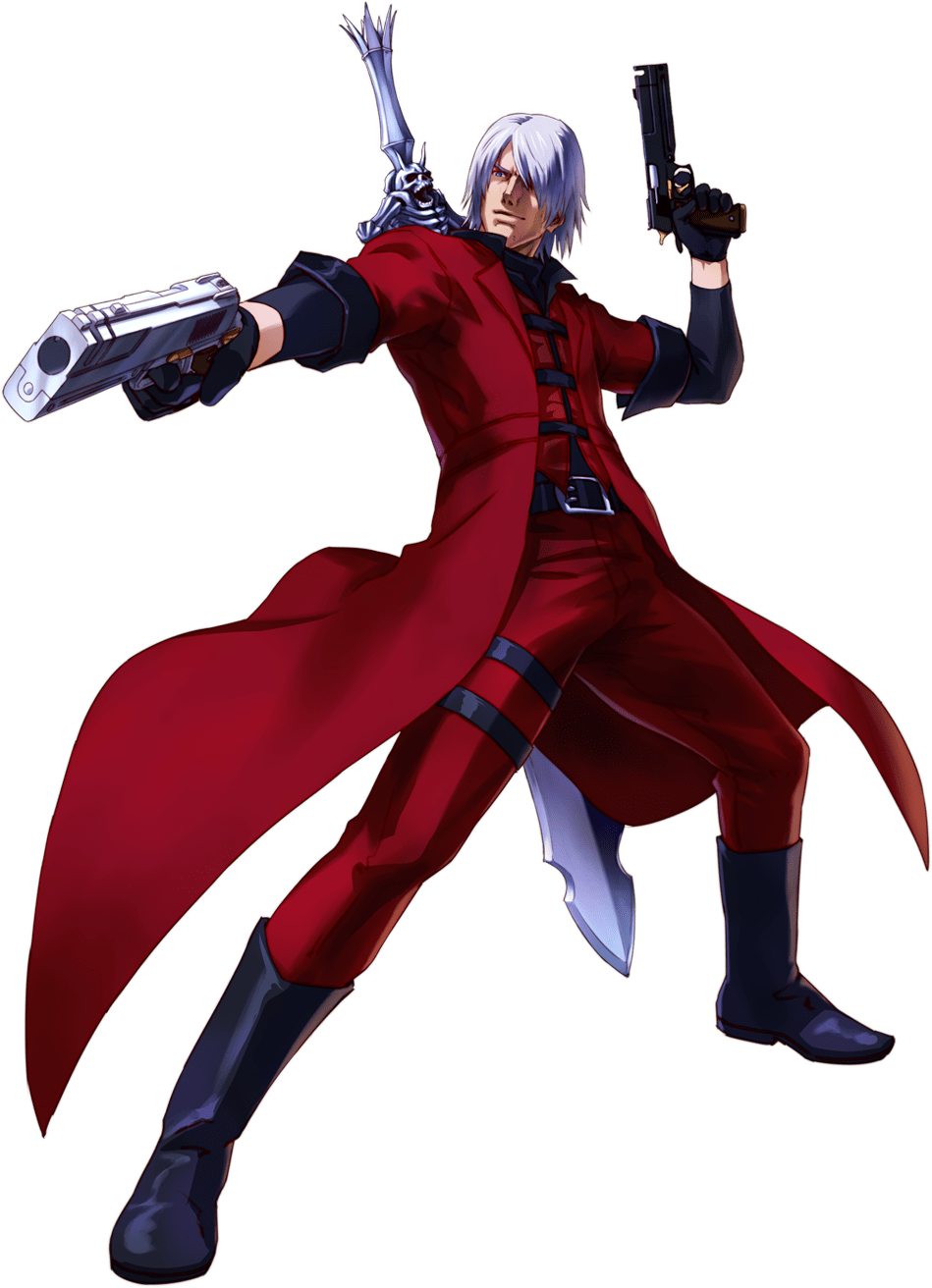 Dante’s default would be his DMC5 costume. Thanks to both DMC1 and DMC5 containing fire gauntlets, the alts would be split down the middle with his DMC5 and DMC1 costumes. His DMC5 design would be more stylized and less hyperreal to fit in Smash, resembling his previous more anime incarnations, but the basic design would stay the same. Also, the only high quality artwork of DMC1 Dante is from Project X Zone, so, we’ll just have to make do with that.