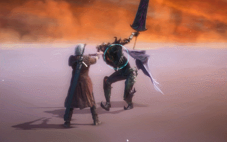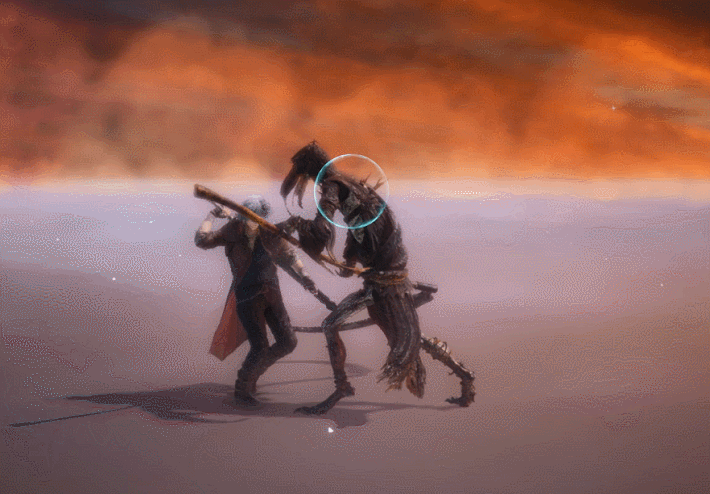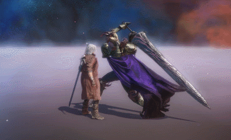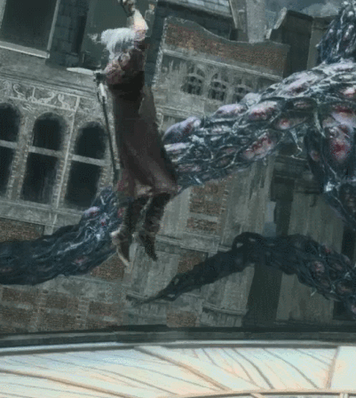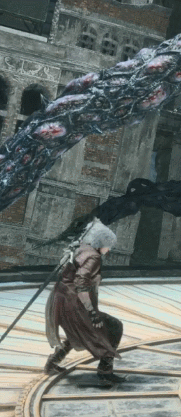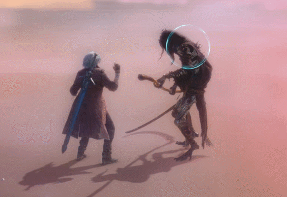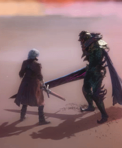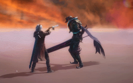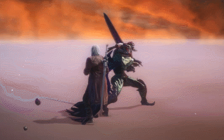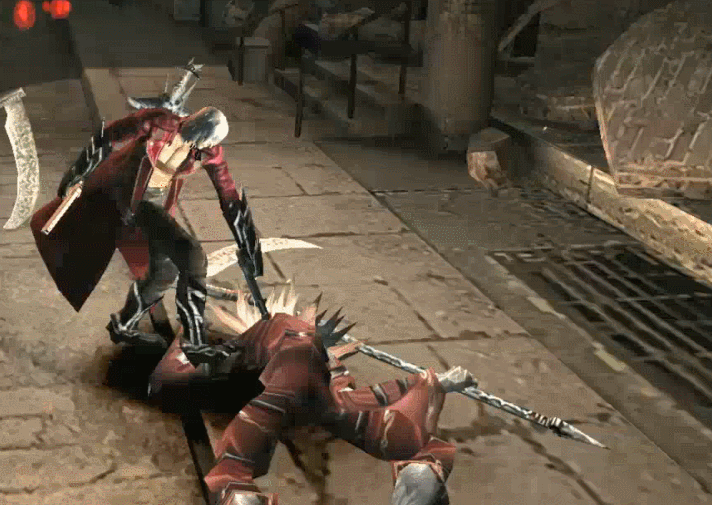 Using his sword as a platform, Dante thrusts it upwards, lifting his opponent up with his blade.