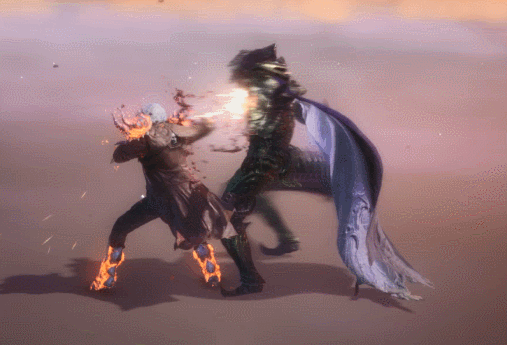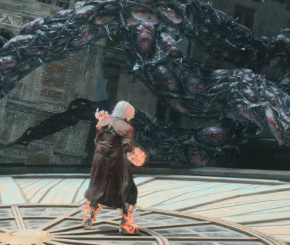 Dante smashes the ground with his gauntlet, unleashing a shockwave of flames. This move is specifically the grounded variant from DMC3, as both the DMC1 and DMC5 variants of this move are aerial.
