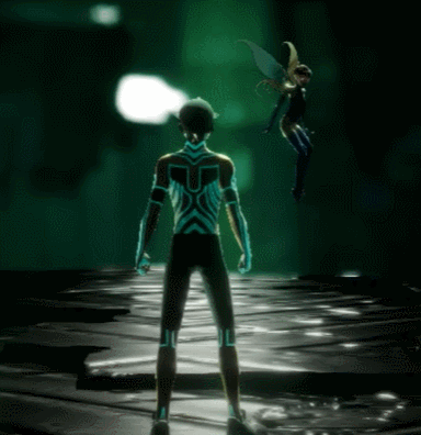 Demi-fiend walking towards the screen shrouded in shadow. After his name appears on the screen he becomes fully obscured by darkness, with only glowing red eyes and his tattoos visible. The eyes of his many demons start opening in the darkness. Based on the True Demon Ending of Nocturne.